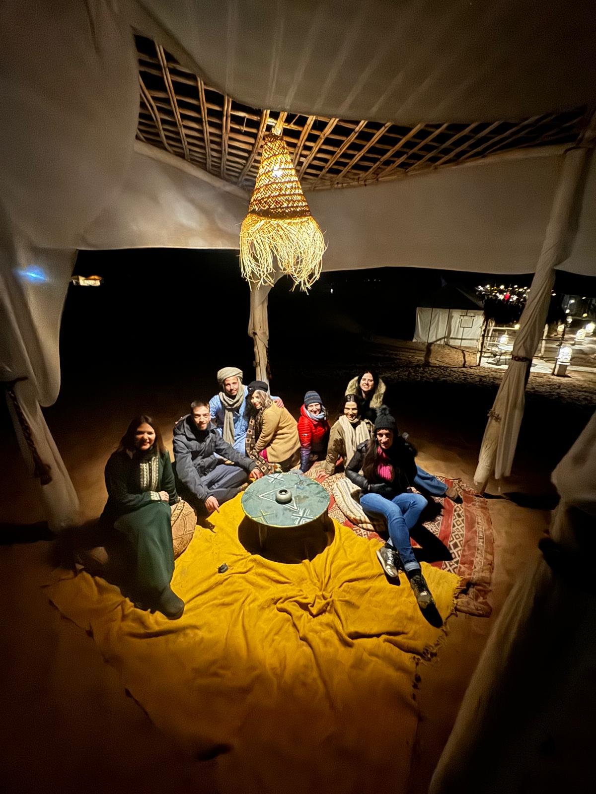 Tendremos la oportunidad de montar en camello en grupos pequeños, para contemplar este espectáculo del atardecer, en el primer día del año 2026. Cena y alojamiento en Jaimas. Tras la cena habrá fuego con la música de tambores bereberes