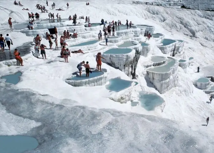 Visita al famoso Castillo de algodón, maravilla natural de gigantescas cascadas blancas, estalactitas y piscinas naturales formadas a lo largo de los siglos por el paso de las aguas cargadas de sales calcáreas procedentes de fuentes termales.